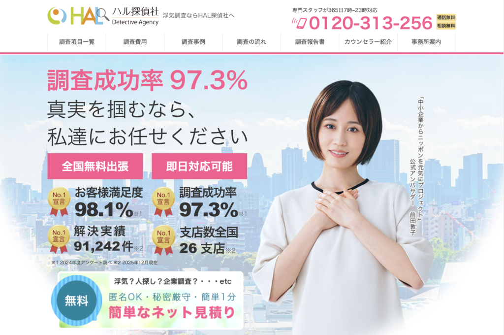 HAL探偵社は「調査成功率97.6%」が特徴の実力派探偵事務所。証拠が取れなければ0円の完全成功報酬制プランも用意されており、リスクを抑えて調査を依頼できます。調査員1名1時間7,000円からの明確な料金体系で、見積もり後の追加料金は一切なし。